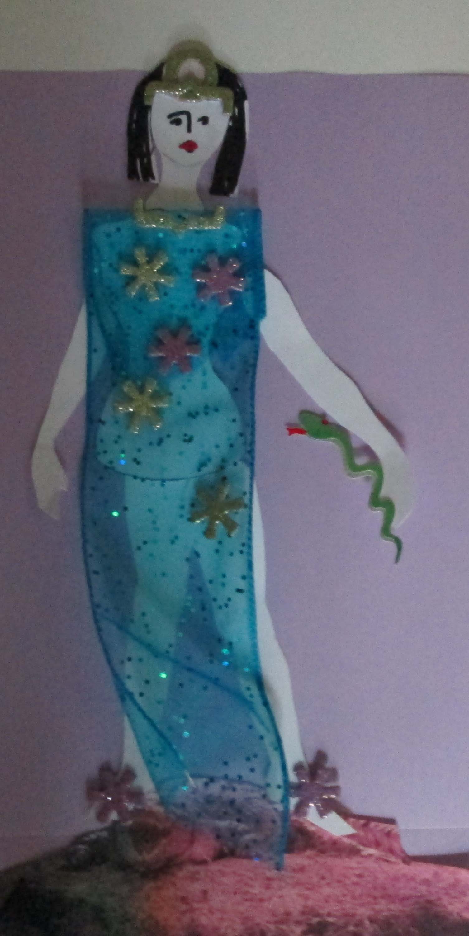 I made the Egyptian goddess Isis. Why? Because in Edmund Spenser’s great 16th century poetic epic, The Faerie Queene, when the woman warrior Britomart is torn between her roles as nurturing woman standing by her man and bold warrior maiden, she turns to Isis for advice. She travels to the temple of Isis, and there she has an amazing dream: Isis stands on a crocodile, subduing it with her wand. She wears the moon on her head, and she is covered with precious gems. She tells Britomart to claim her power. That is the key to her true womanhood.