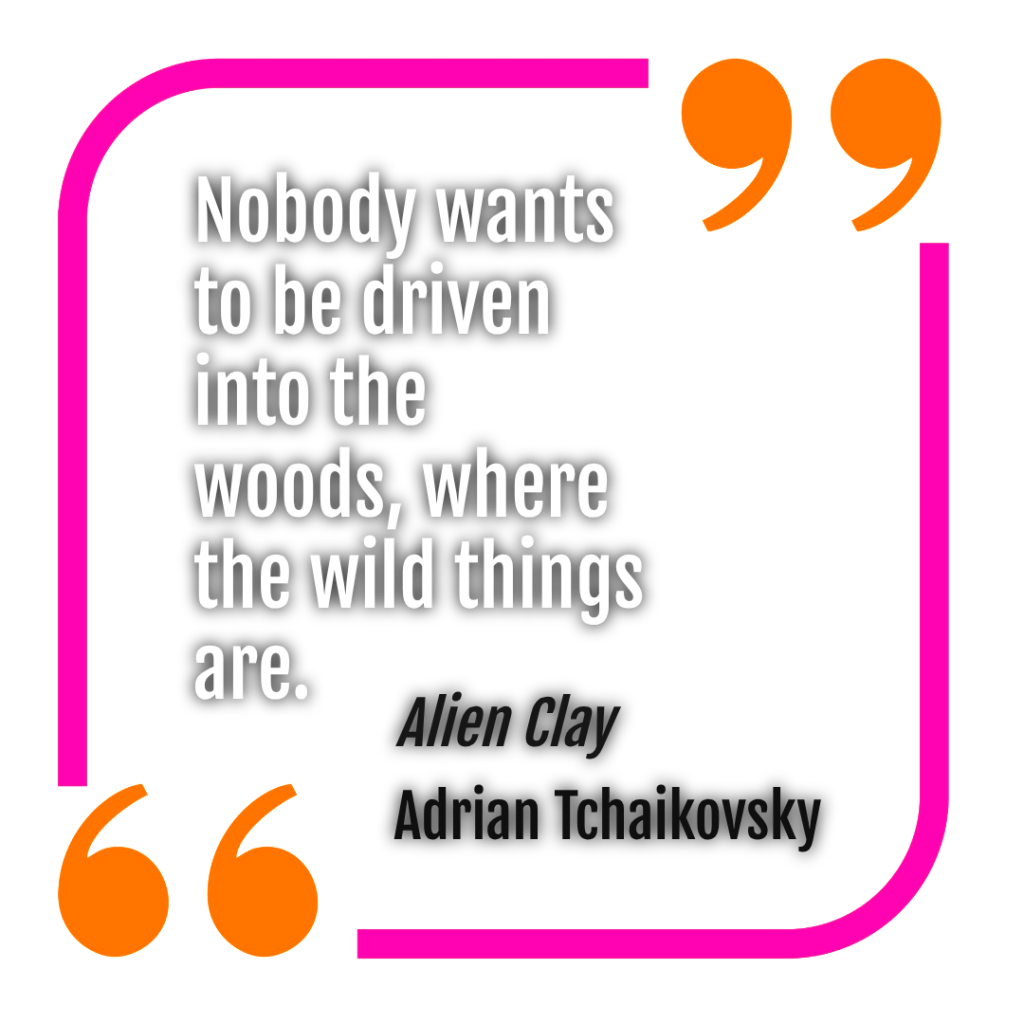 I should say that I found Tchaikovsky’s stand-alone novel Alien Clay (short-listed for both the 2025 Hugo Award for best novel and the Locus Award) much more convincing about the problem of alien communication than this one. In that novel, communication is architecture, biology, spatial relationships. It’s made up of the way a culture manipulates its physical space and inhabits its biological niche. Communication is the way the individuals of a culture and an ecosystem (maybe the same thing?) fit into the whole. I found that very intriguing, and the process the characters undergo to reach that conclusion very intriguing too, because it made me ponder what makes us human. See my quick review of that book HERE, but in that review, I paid too little attention to this fascinating communication aspect. I hope I’m rectifying that by mentioning it here. And I will also use Alien Clay for my next. . .