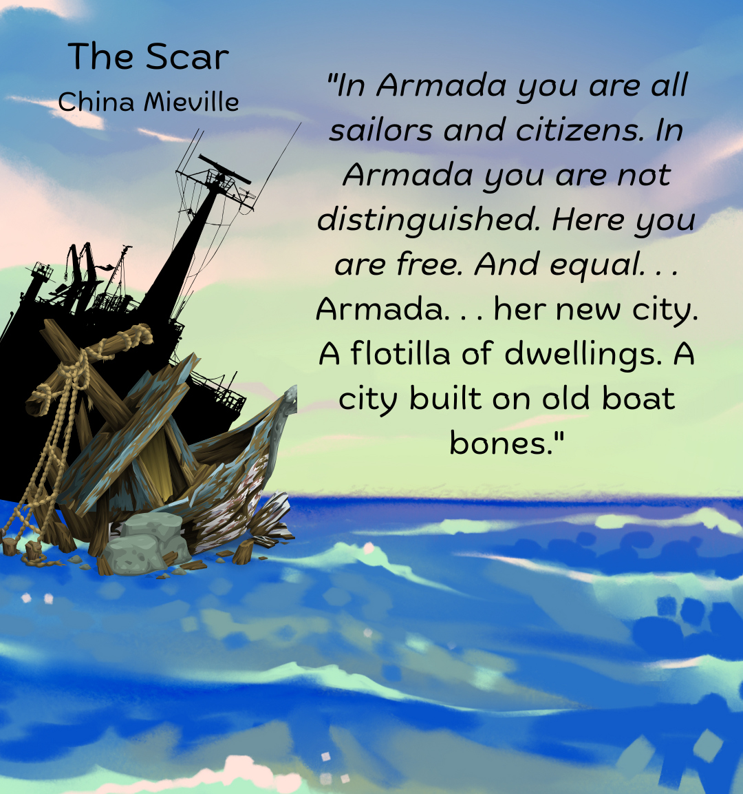 China Miéville, one of the best writers in any genre I’ve ever read, published The Scar in 2002. It may be my favorite, but that’s a hard call. Miéville writes what has been called “New Weird” fiction. This novel is weird, all right. Also absolutely fascinating, part of a trilogy set in the same fantasy world. Some of the characters overlap from book to book, but they are not sequels.
